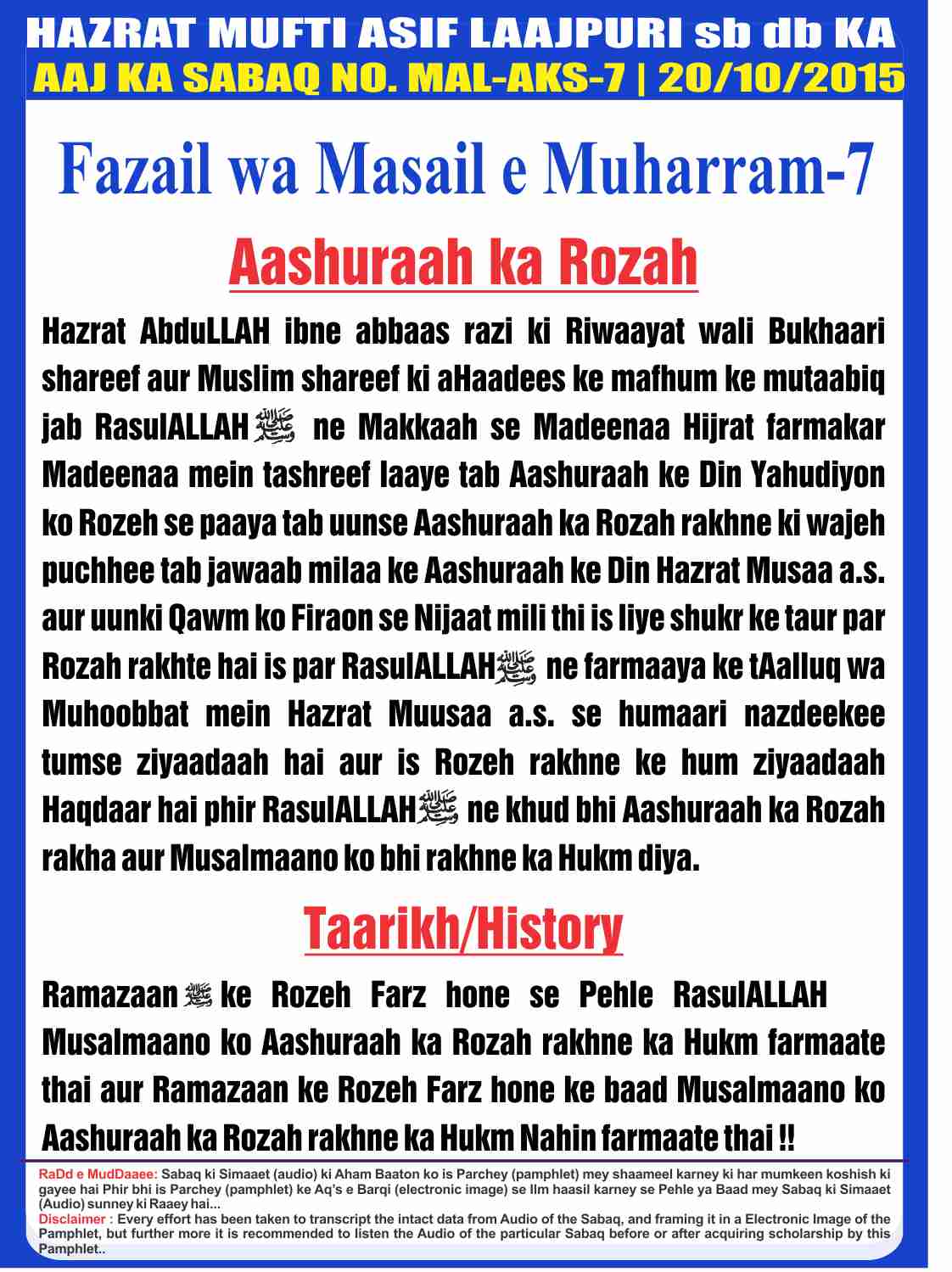 Ramazaan ke Rozeh Farz hone se Pehle RasulALLAH صلی اللہ علیہ وسلم Musalmaano ko Aashuraah ka Rozah rakhne ka Hukm farmaate thai aur Ramazaan ke Rozeh Farz hone ke baad Musalmaano ko Aashuraah ka Rozah rakhne ka Hukm Nahin farmaate thai !!